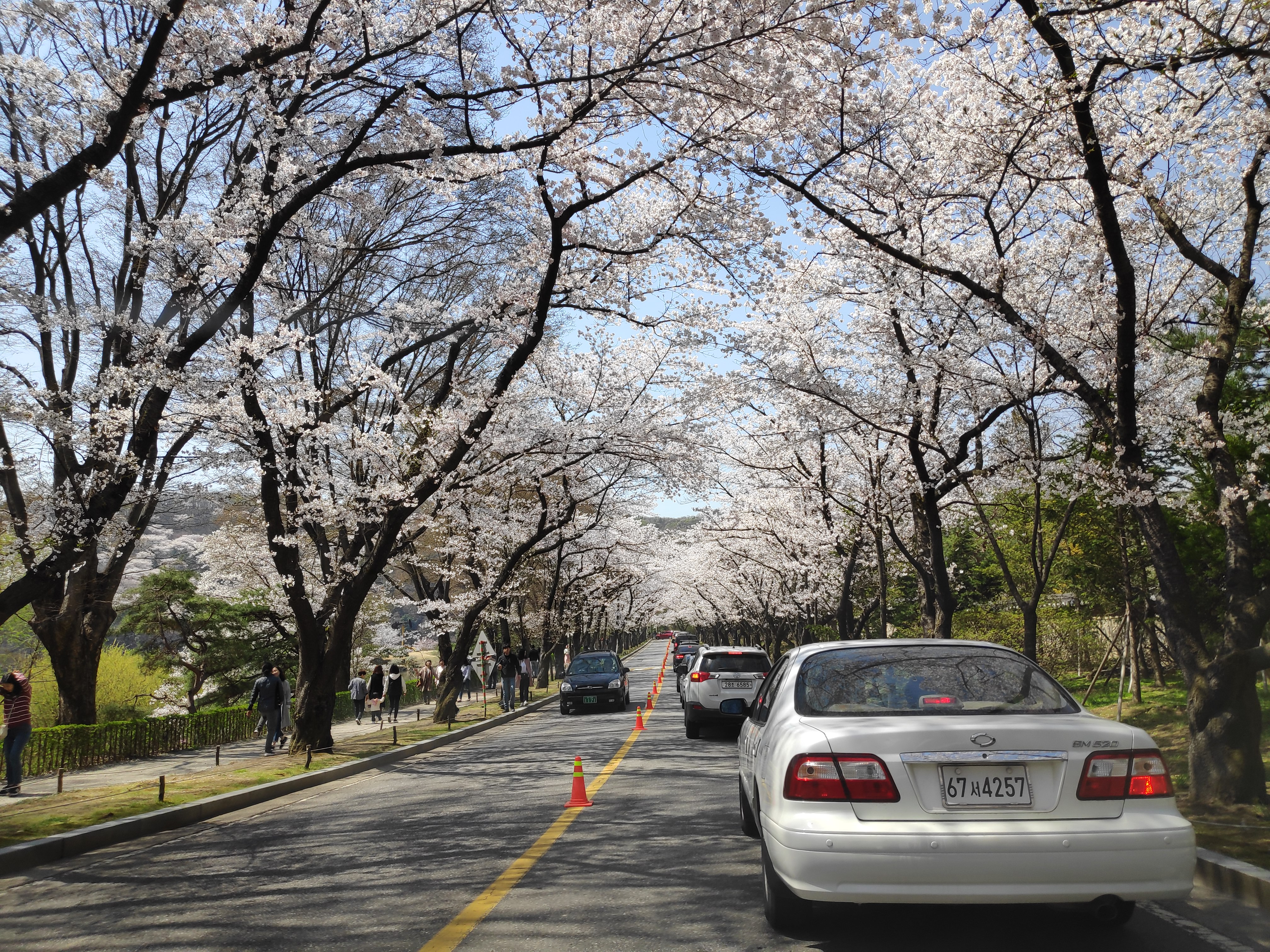 평일이지만 점심시간이라서 그런지 사람들이 많았다. 축제기간에는 차로 못들어가게 했는데 지금은 주차장으로 들어갈 수는 있었다. 차가 이렇게 많이 막힐 줄은 몰랐지만... 차라리 길가에 주차를 하고서 걸어들어갈 걸 그랬다. 벚꽃은 여기가 젤 예쁘다. 안에도 예쁘긴 하지만 이런 뷰는 나오지 않는다.