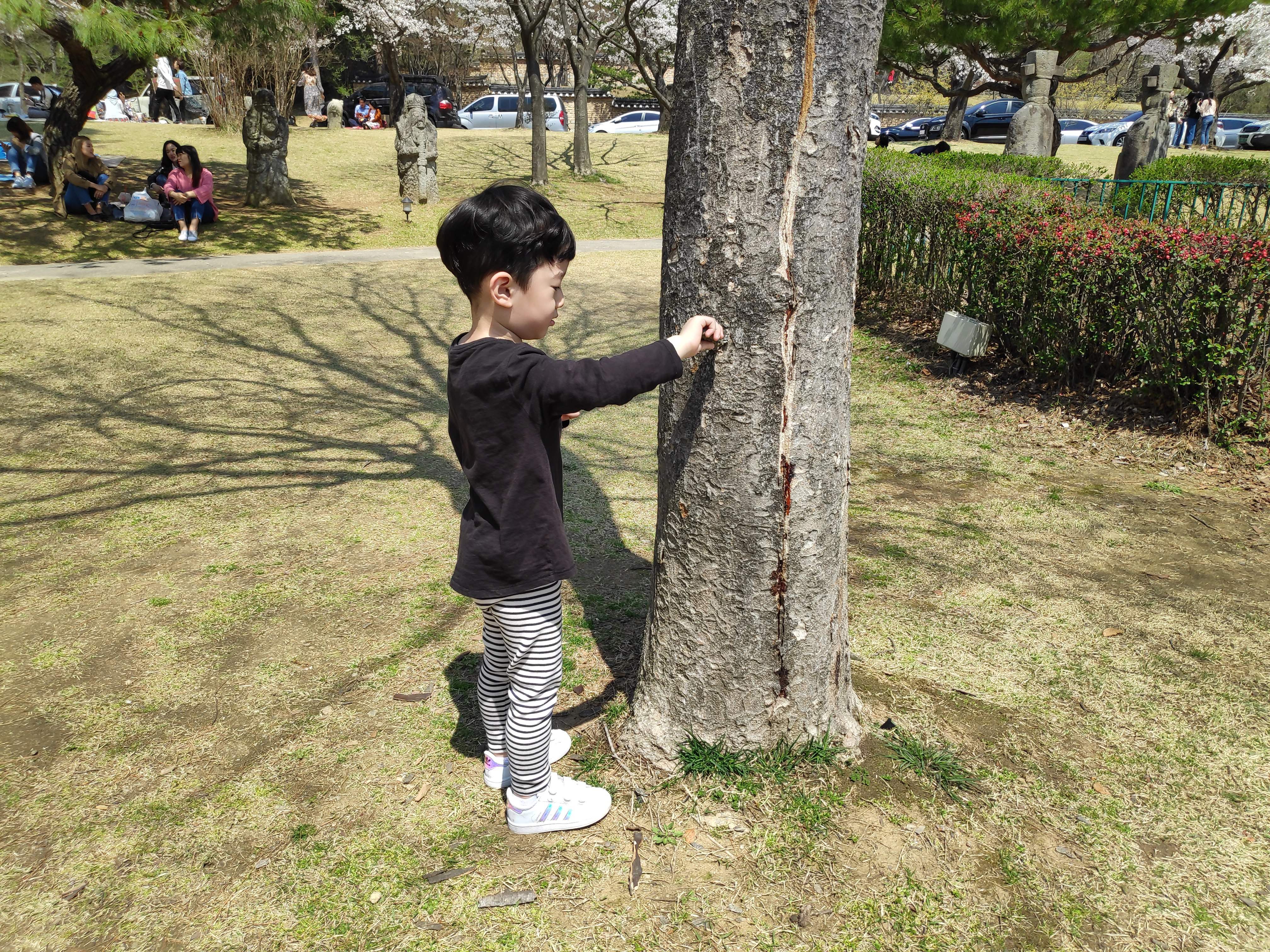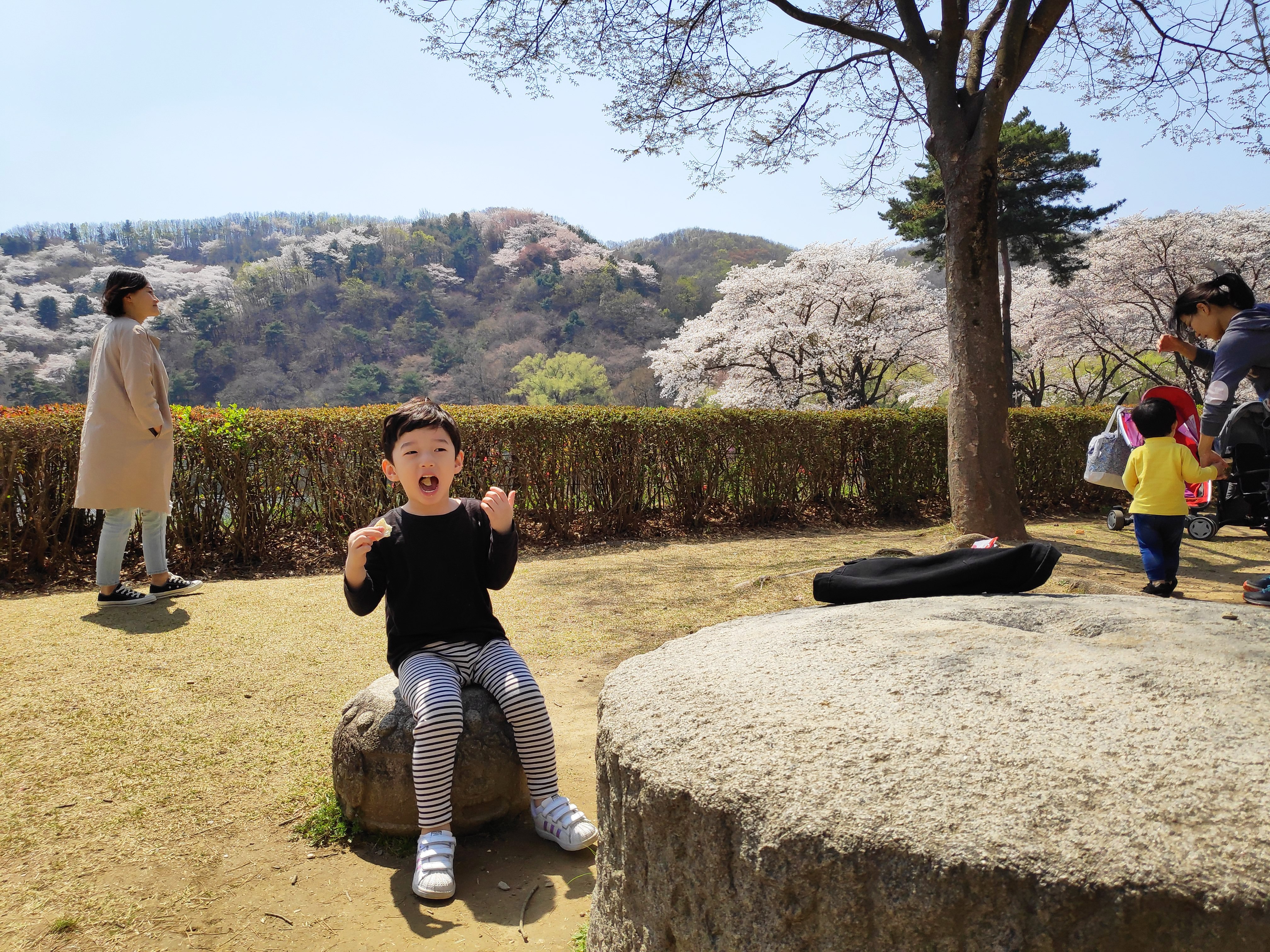 오랜만에 예쁜 공원에 아들과 둘이 오니 너무 신이 났다. 개미도 보고 나무도 만져보고 의자에 앉아서 간식도 먹고 지나가는 사람도 구경하고 사진도 찍어보고 지나고 보니 굉장히 짧은 시간이었지만 너무 좋은 시간이었다. 점심시간이라서 그런지 벚나무 아래서 돗자리를 펴고 점심을 먹은 사람이 많았다.