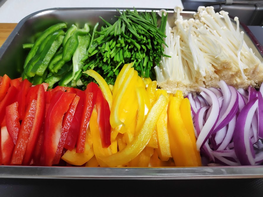 - 파프리카, 피망, 양파를 폭 0.3-0.5cm, 길이 5cm정도로 채썬다.