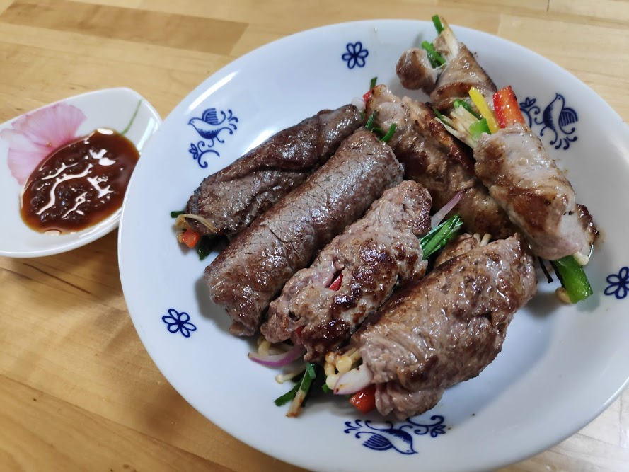 600g에 84000원, 8800원, 6000원 하는 고기 3종류다. 하나는 한우 안심, 하나는 호주산 설깃살, 하나는 돼지 앞다리살이다. 모두 구워서 맛을 보니 소고기가 좀 더 잘 어울렸고 돼지고기도 나름 괜찮았다. 사실 100g에 12000원이나 하는 고기를 사용하기에는 고기 맛이 중요하지 않은 음식이라고 생각한다. 대충 얇은 소고기 쓰면 되지 않을까 싶다.