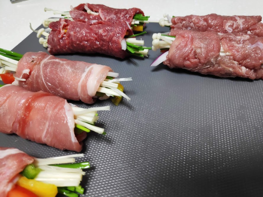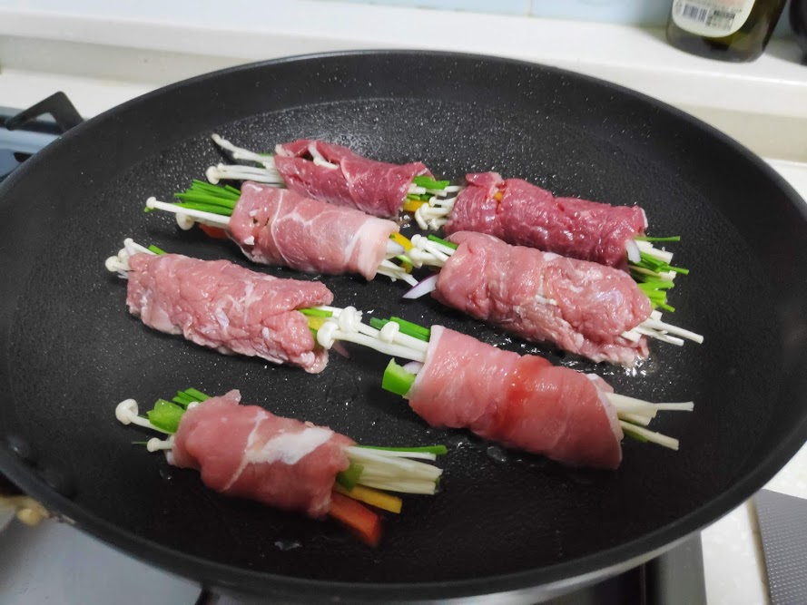 - 소고기에 야채를 얹어 둘둘 만다.